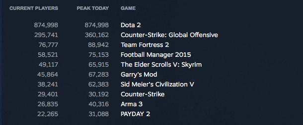 Την 1η Ιανουρίου 2015 στις 21:00 βρέθηκαν online 8,466,441 χρήστες. Το Dota 2 παραμένει το κορυφαίο παιχνίδι που παίζουν οι χρήστες με μεγάλη διαφορά, ενώ ακολουθούν τα Counter-Strike, Team Fortress 2, Football Manager,Skyrim και Civilization.