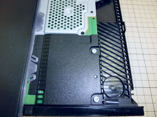 - Κάτω από το δευτερεύον κάλυμμα, ο ελεγκτής Blu-Ray LSI είναι το χέρι κολλημένο στην έξοδο 12V του τροφοδοτικού, ενώ η ασύρματη κεραία βρίσκεται στο πίσω μέρος. Το εξώφυλλο είναι εκεί για να αποφευχθεί η κατά λάθος επαφή με την έξοδο 12V όταν αφαιρείτε τη μονάδα σκληρού δίσκου.