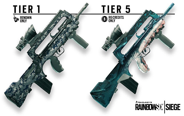 • Τα skins θα έχουν πέντε διαφορετικές βαθμίδες και όλα θα είναι διαθέσιμα για αγορά, ενώ θα προστεθούν και άλλα μετά από την κυκλοφορία. Οι βαθμίδες 1, 2 και 3 θα μπορούν να ξεκλειδωθούν με την χρήση Renown ενώ οι βαθμίδες 4 και 5 απαιτούν R6 Credits.