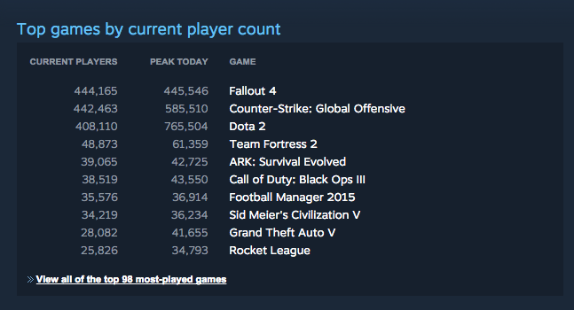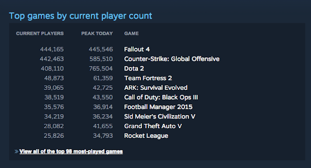 Σήμερα λοιπόν στο Steam το Fallout 4 κατάφερε να πάρει την πρωτιά ανάμεσα στα παιχνίδια με τους περισσότερους συνδεδεμένους χρήστες εκείνη τη στιγμή. Βέβαια αυτο επιτεύχθηκε όχι επειδή αυξήθηκαν οι χρήστες του Fallout 4 αλλά επειδή μειώθηκαν αυτοί του Counter Strike: Global Offensive.