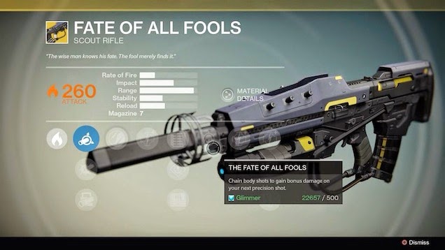 Mη σημαντική σημείωση: Το Fate Of All Fools, δεν υπάρχει πουθενά ακόμη στο παιχνίδι. Η ύπαρξη του όμως στη Destiny Database σημαίνει ότι ίσως κυκλοφορήσει με κάποιο DLC. Αλλά πραγματικά έχει καμιά σημασία;