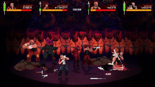 Russia Bleeds ο παίκτης είναι εθισμένος σε μια ναρκωτική ουσία, και κρατάει μια σύριγγα η οποία με την μία χρήση του αυξάνει το health, όμως στις τρεις τον βάζει σε μια κατάσταση  rage. Για να γεμίσει την σύριγγα ο παίκτης πρέπει να μαζέψει το αίμα άλλων εθισμένων.