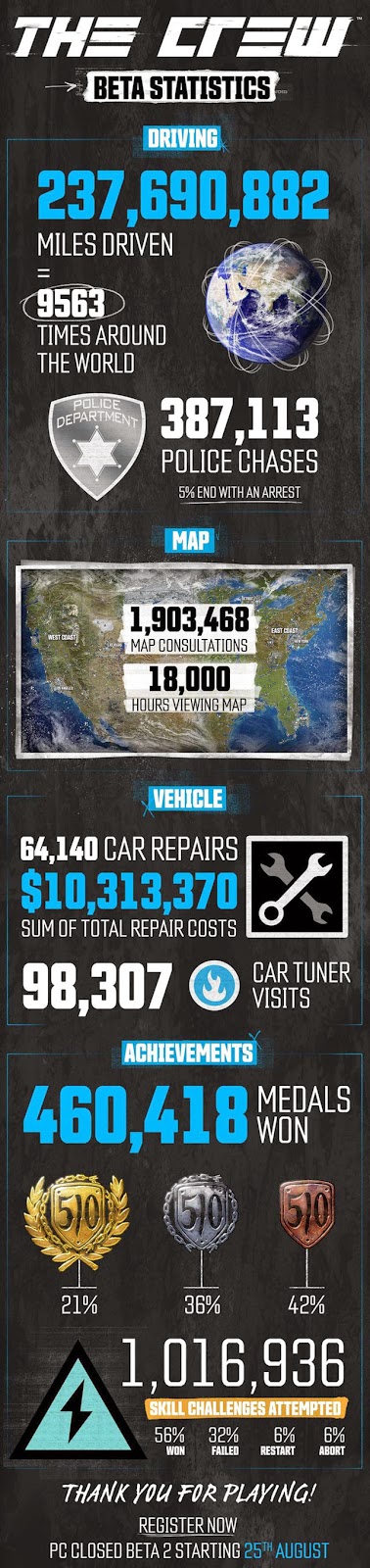 Η Ubisoft δημοσίευσε σήμερα ένα infographic που περικλείει όλα τα στατιστικά από την πρώτη beta του επερχόμενου παιχνιδιού της, The Crew.