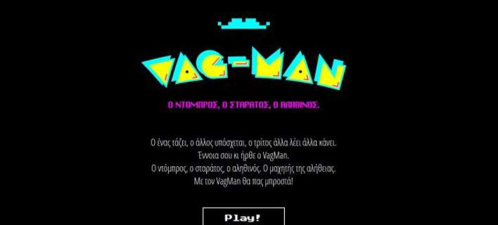 Όπως περιγράφεται και στην σελίδα του παιχνιδιού, ο Vag-Man είναι ο “μαχητής της αλήθειας”, που ήρθε να νικήσει το ψέμα. Στην θέση των φαντασμάτων, βρίσκονται γνωστά πρόσωπα της ελληνικής πολιτικής.