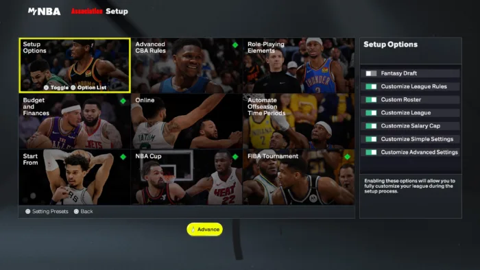 Στο μενού των ρυθμίσεων, είναι απαραίτητο να ενεργοποιηθεί η επιλογή custom rosters στο setup options customization, η οποία ξεκλειδώνει τη δυνατότητα εισαγωγής custom roster, επιτρέποντας την πλήρη αλλαγή των ομάδων της λίγκας.