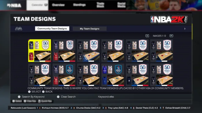 Μέσα από το 2K Share Team Designs, μπορείτε να αναζητήσετε συγκεκριμένες ομάδες για να κατεβάσετε και να εφαρμόσετε τις επίσημες εμφανίσεις, τα λογότυπα και τα γήπεδα που έχουν δημιουργηθεί από την κοινότητα.