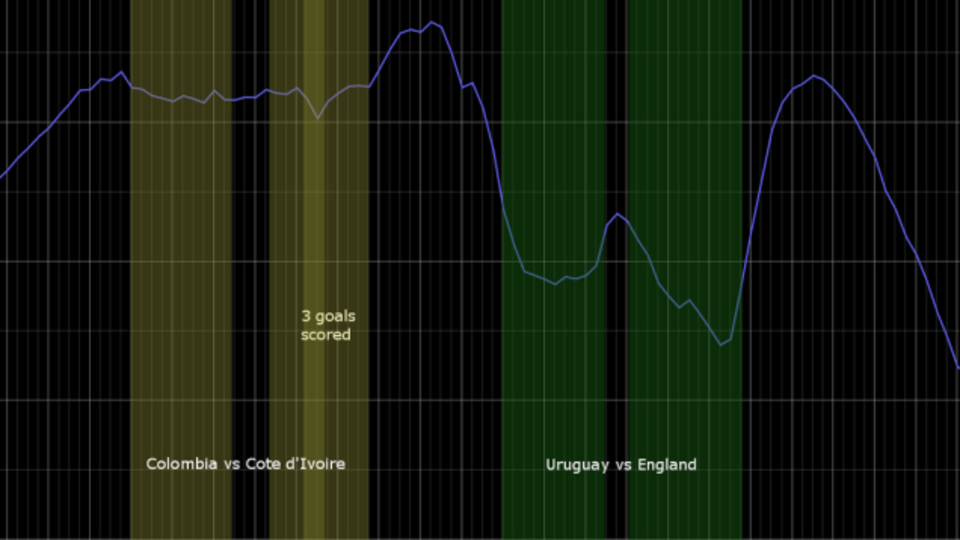 Όπως βλέπετε στην εικόνα παραπάνω τo ματς ανάμεσα στην Κολομβία και την Ακτή Ελεφαντοστού δεν προσέλκυσε τόσο τους gamers σε αντίθεση με το Ουρουγουάη-Αγγλία. Ο αριθμός των παιχτών μειώθηκε δραματικά την ώρα του αγώνα, ανέβηκε κατά την διάρκεια της ανάπαυλα του ημιχρόνου, ενώ όσο το ματς πήγαινε προς το τέλος του, τόσο μειώνονταν ξανά οι online παίχτες.