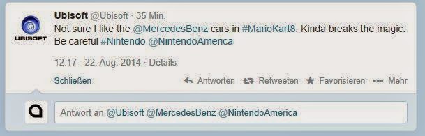 Ένα tweet το οποίο επέκρινε το Mercedes Benz DLC του Mario Kart 8 αφαιρέθηκε από το λογαριασμό της Ubisoft στο Twitter, με την εταιρία να ζητά και συγγνώμη για αυτό.