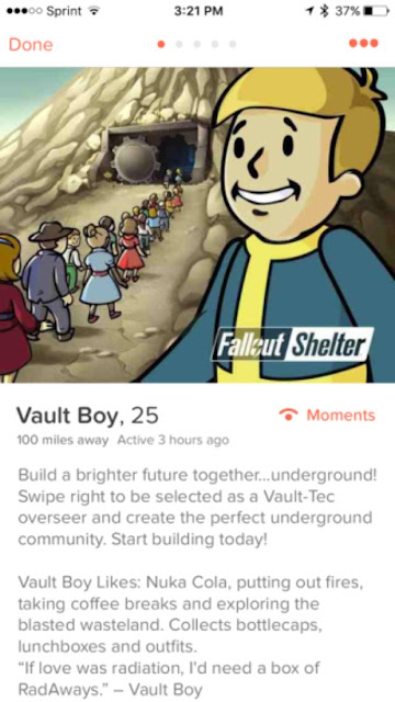Όπως ανακάλυψε το Kotaku, η Bethesda για να προωθήσει το Fallout Shelter δημιούργησε στο Vault Boy το δικό του, επίσημο προφίλ στην εφαρμογή γνωριμιών, Tinder!